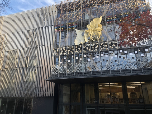 | 2022年末に完成した国際交流棟はパブリックアートを施した芸術大学ならではのアートと建築が融合された建物となっています。 紹介する厨房は棟内2階のウッド調の食堂と隣接し開放的なつくりとなっています。 留学生と学生、教職員らが食事を通して交流し憩う場として展示・演奏など作品発表の場所としても利用されています。 |